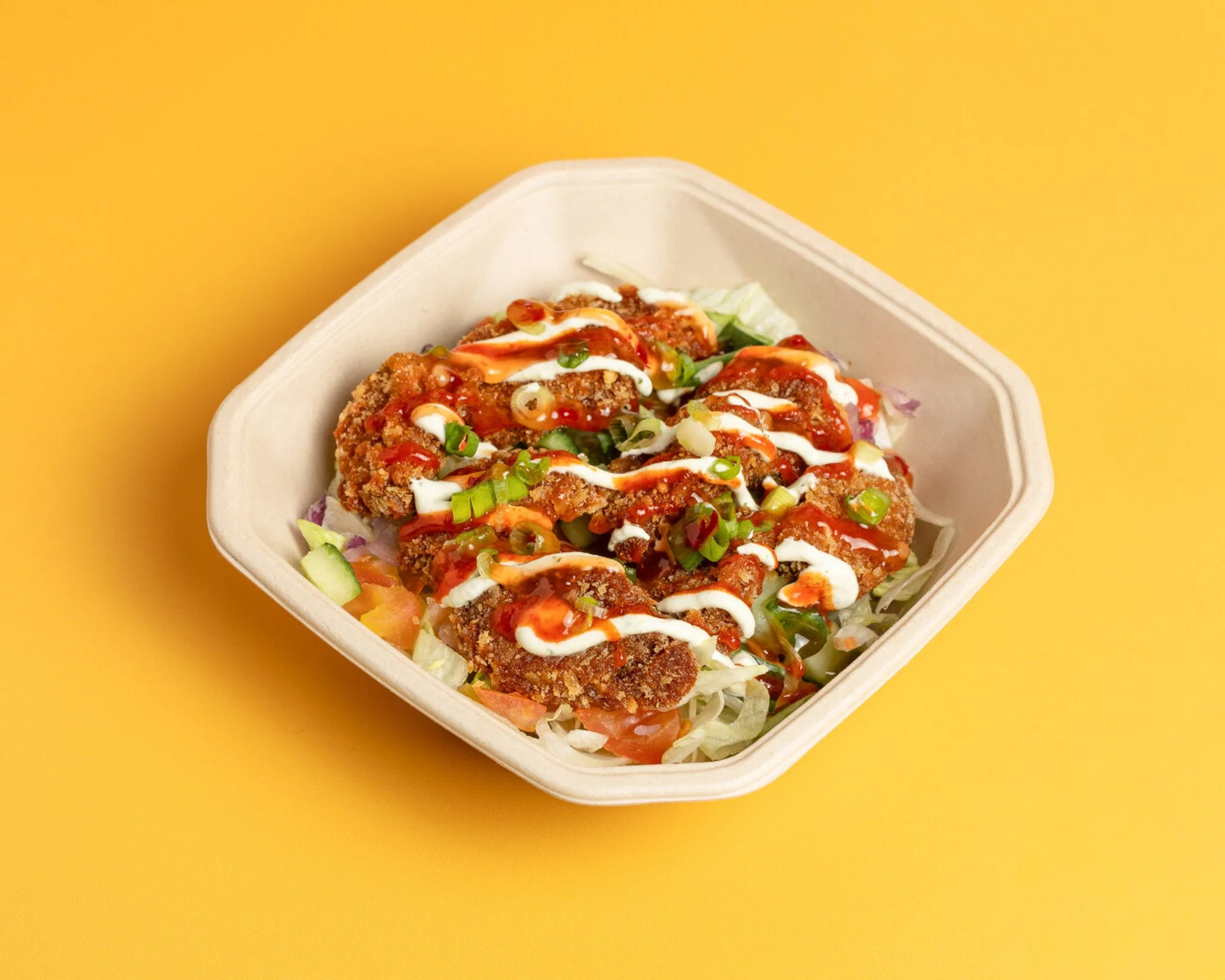 Tofu coated in a special blend of herbs and spices, battered, panko-fried, and golden, served on a fully customisable salad base. Start with lettuce, tomato, cucumber, and onion, then add your favourite sauces for a vibrant vegan option.