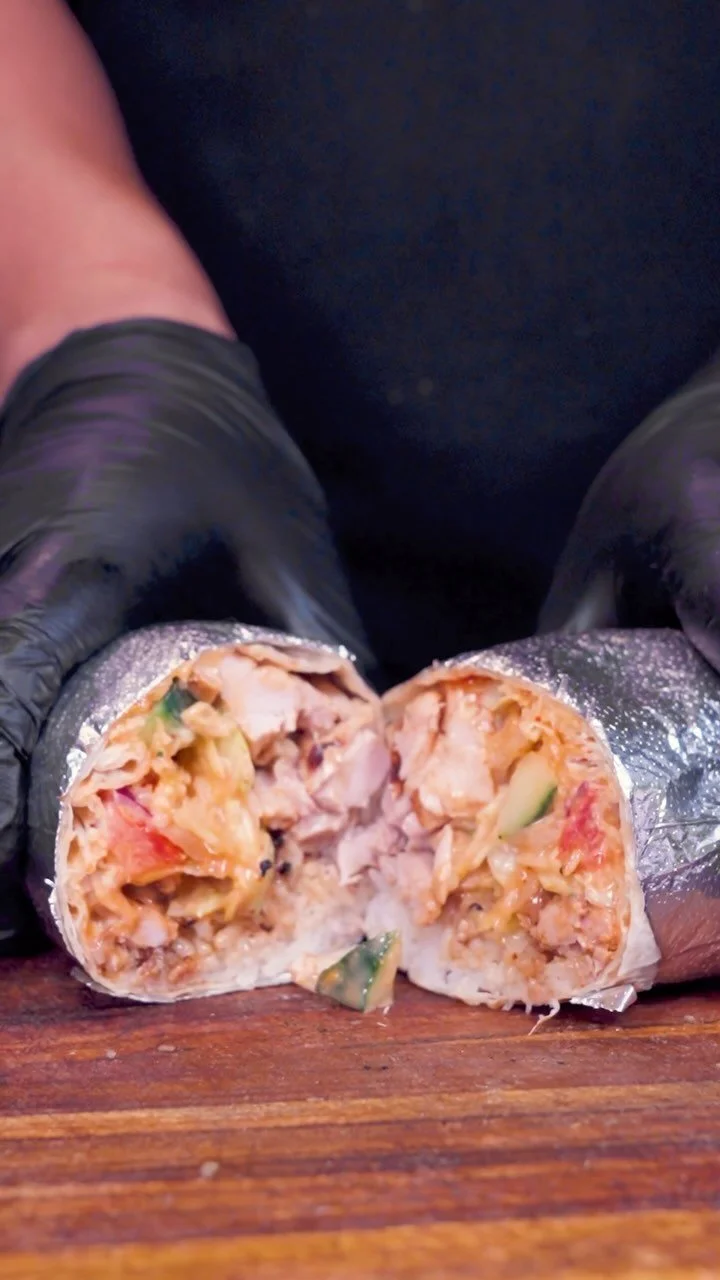 Overnight cooked beef adobo inside a tortilla wrap with garlic rice and a choice of salads and sauces